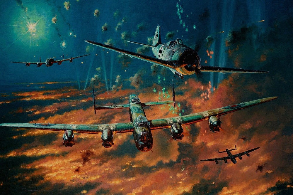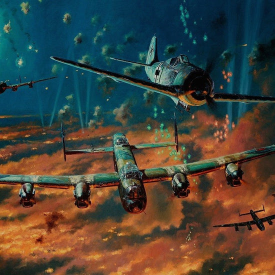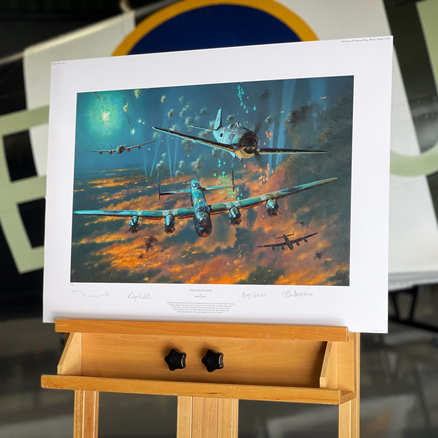 Anthony Saunders’ evocative painting, Berlin Boar Fight, powerfully captures the tension and chaos of that dramatic night. Released as part of the Night Skies over the Reich Portfolio alongside Night Hunters, the artwork draws on first hand accounts from those who experienced the raid, delivering an authentic and stirring tribute to one of the most pivotal episodes of the air war over Europe.