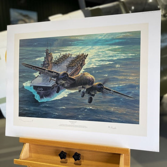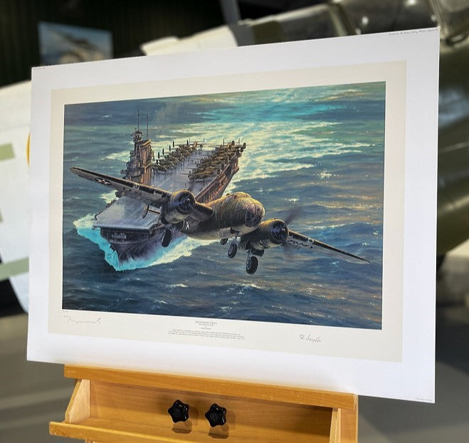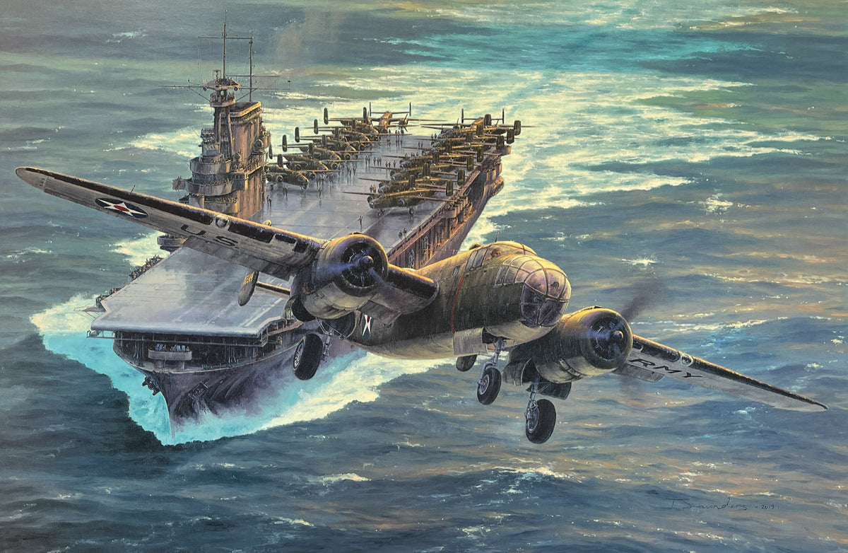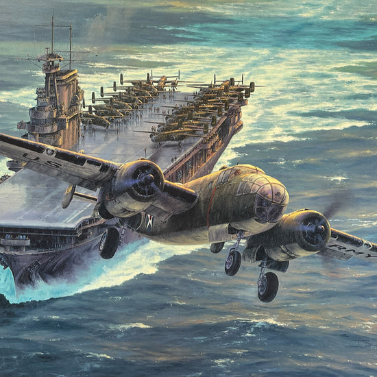 Anthony’s commemorative painting captures the moment Doolittle’s B-25 lifts off the Hornet’s rain-soaked deck, leading his squadron into history.
