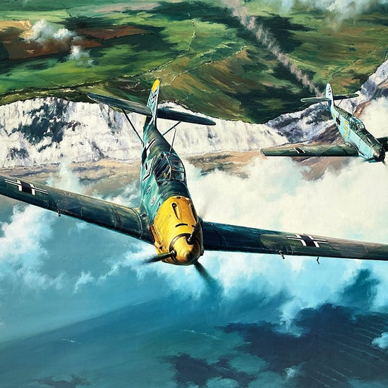 This vivid account captures a typical scene from those relentless aerial battles. A Me109 from JG-26, damaged during combat, struggles with an overheating engine, trailing smoke as it limps away. But the squadron's legendary commander, Adolf Galland, moves in to guide the wounded fighter safely back across the Channel.