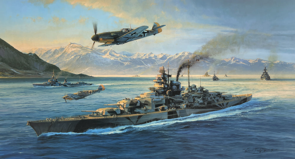 Overhead, Messerschmitt Me 109s of Jagdgeschwader 5 (JG 5), based in Petsamo, provide aerial cover, while escort vessels form an imposing naval flotilla. Set against the dramatic backdrop of Norway’s towering mountains, Taylor’s masterful composition captures the intensity and realism of this pivotal World War II operation.