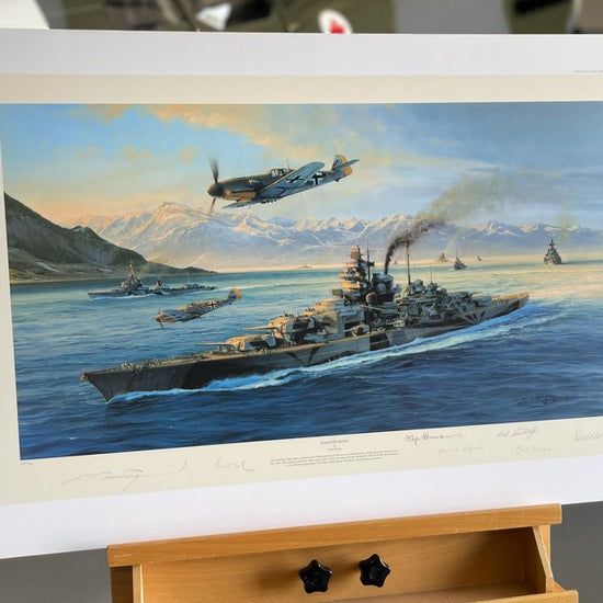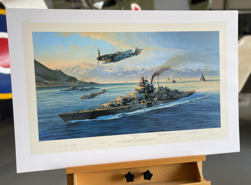 Signatures: Each print of this edition has been hand signed by six veterans who either served on the Tirpitz or flew escort missions for it: