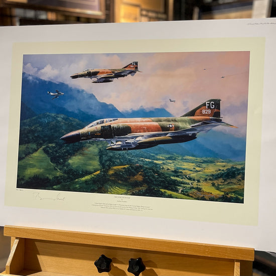 Flying the formidable F-4C Phantom II, Olds led his squadron into some of the war’s most intense battles. On May 20, 1967, depicted in Anthony Saunders’ MiG Encounter, Olds and his flight of eight Phantoms engaged North Vietnamese MiG-17s, downing two and securing his third and fourth air victories. By the time Olds left command, the ‘Wolfpack’ had become the USAF’s top MiG-killing wing. With 152 combat missions and 17 total aerial victories, he cemented his legacy as a triple ace.